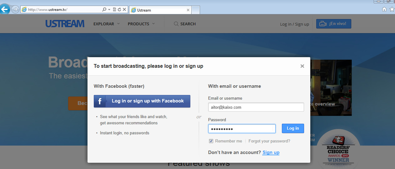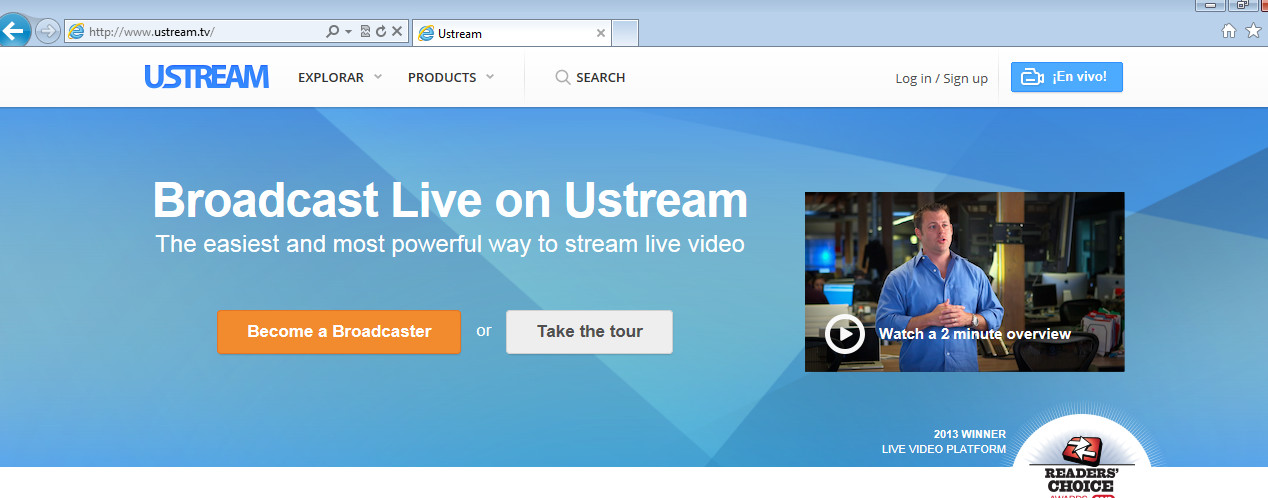 1.- Entramos en la url http://www.ustream.tv y pinchamos En Vivo (parte superior derecha)