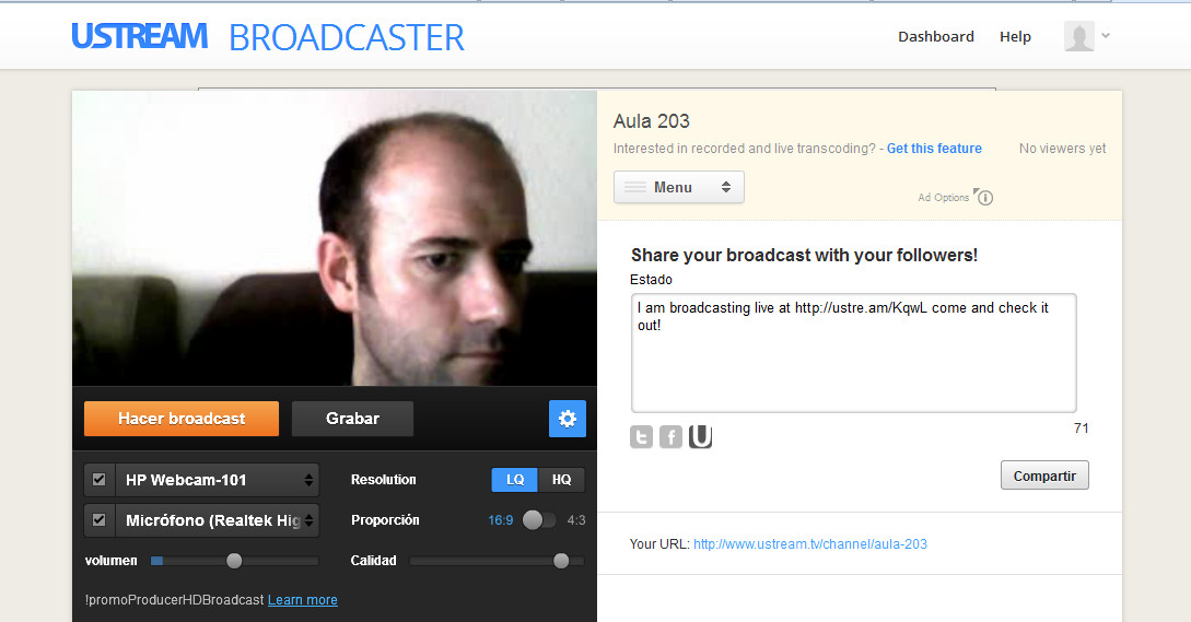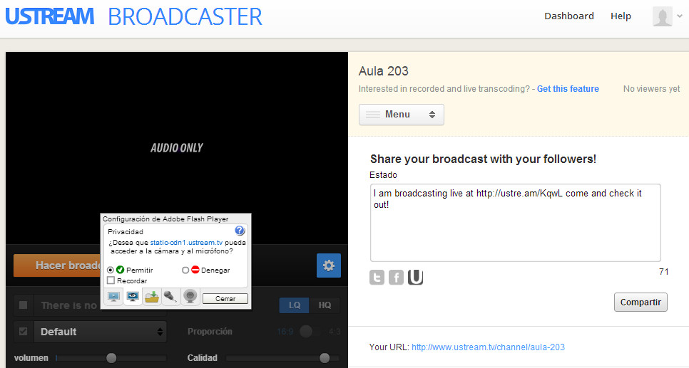 5.- Los usuarios podrán acceder a nuestra emisión desde http://ustre.am/KqwL. Esta dirección se puede compartir por Twitter, Facebook o Google Plus.